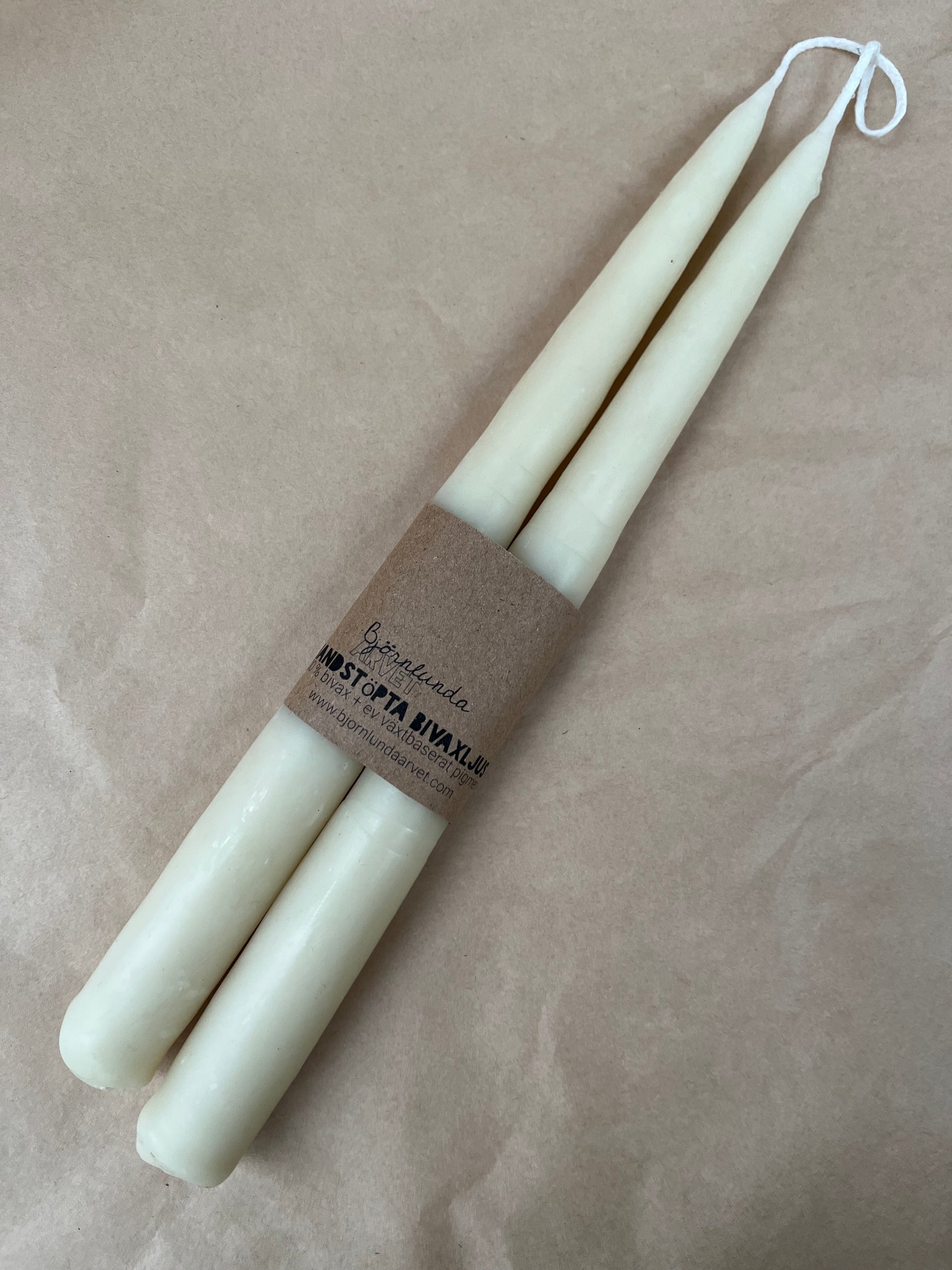 Två stycken handstöpta bivaxljus i färgen mjölk.