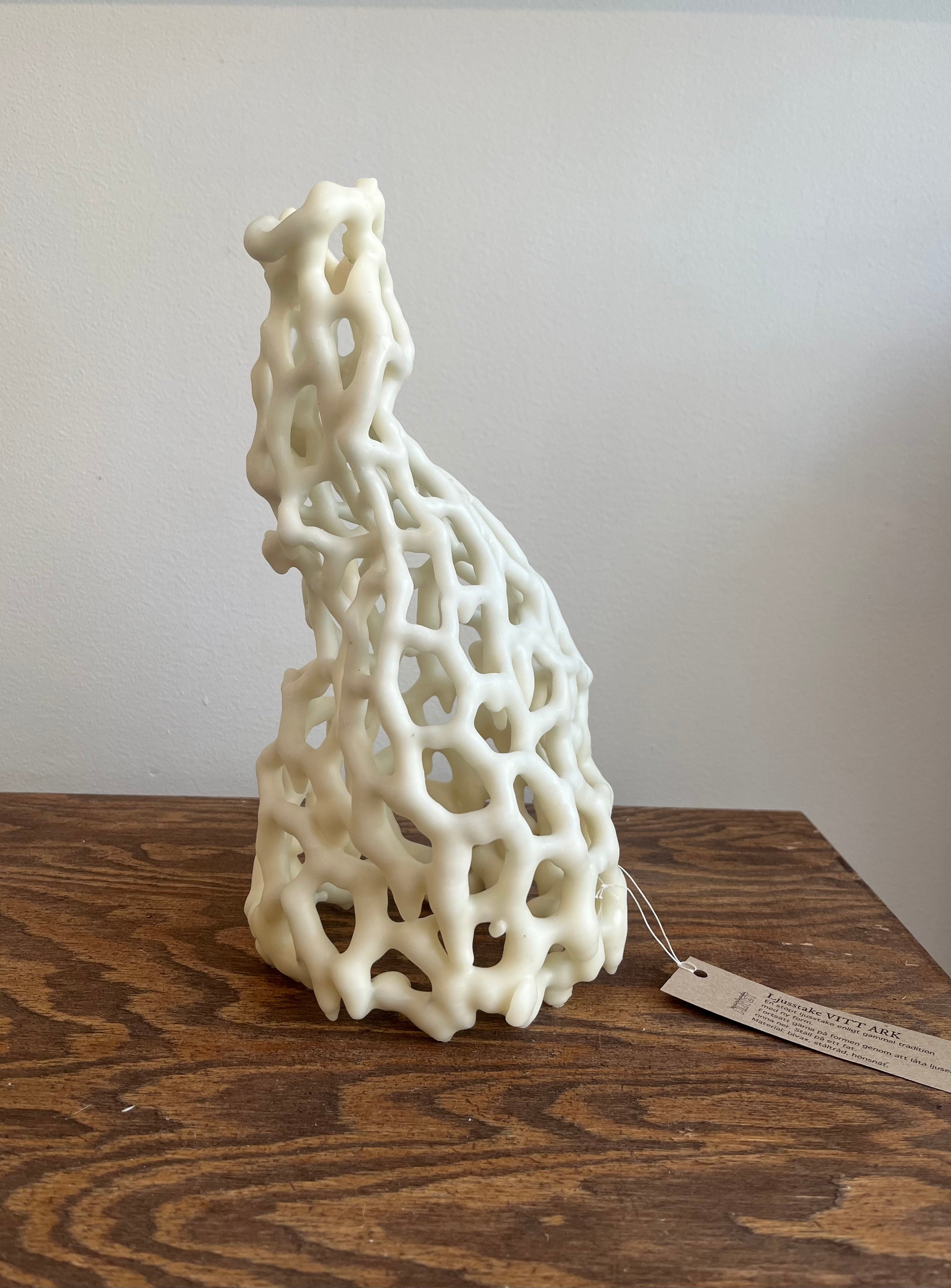 Candlestick made of white beeswax and steel wire.