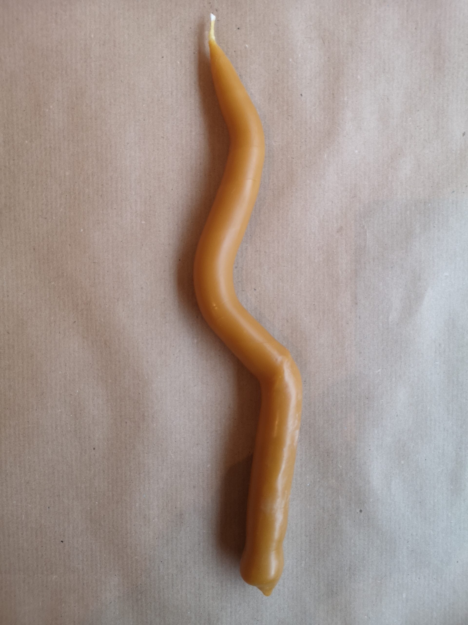 Mina ljus är handstöpta av bivax och färgade med växtpigment. Bivaxet ger en matt och aningen transparent yta. Jag eftersträvar inte perfektion i form av rakhet och släthet utan låter de få ha sin unika karaktär. Jag blandar det naturligt gula vaxet från mina grannbin med vitt som är blekt med aktivt kol (inga kemikalier), samt olika växtpigment. Jag blandar intuitivt till olika kulörer så nyanserna varierar från gång till gång och varje individuellt ljus kan ha sin egen unika färgskiftning. Veke av bomull.