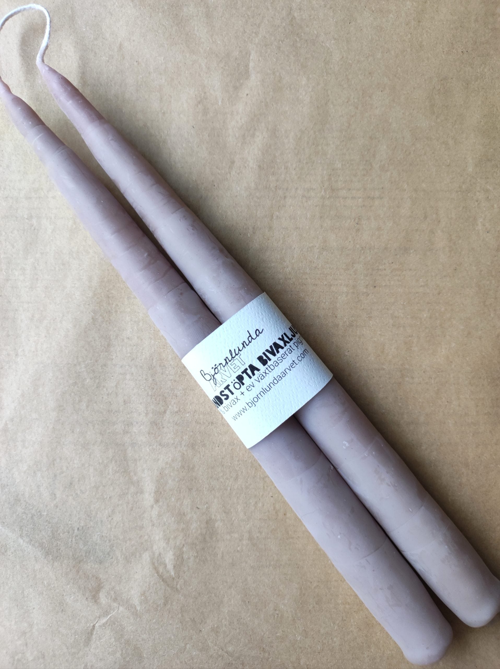 Ett par raka ljus färgade med Alkanna tinctoria, som ger de en grå-rosa-lila ton.