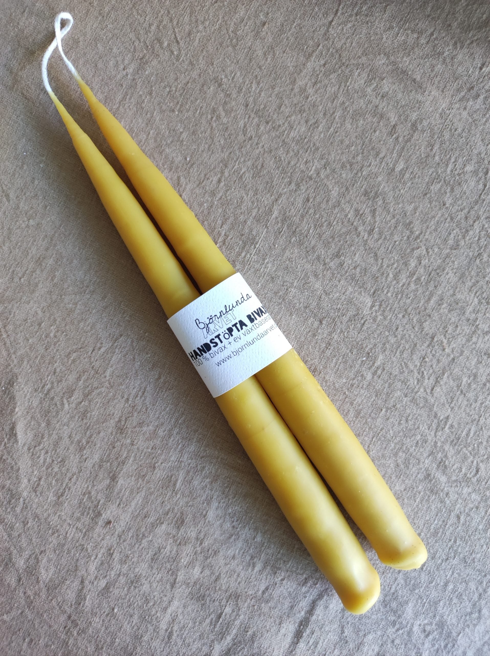 Mina ljus är handstöpta av bivax och färgade med växtpigment. Bivaxet ger en matt och aningen transparent yta. Jag eftersträvar inte perfektion i form av rakhet och släthet utan låter de få ha sin unika karaktär. Vaxet är lokalt och kommer från min närmsta biodlare. Veke av bomull.