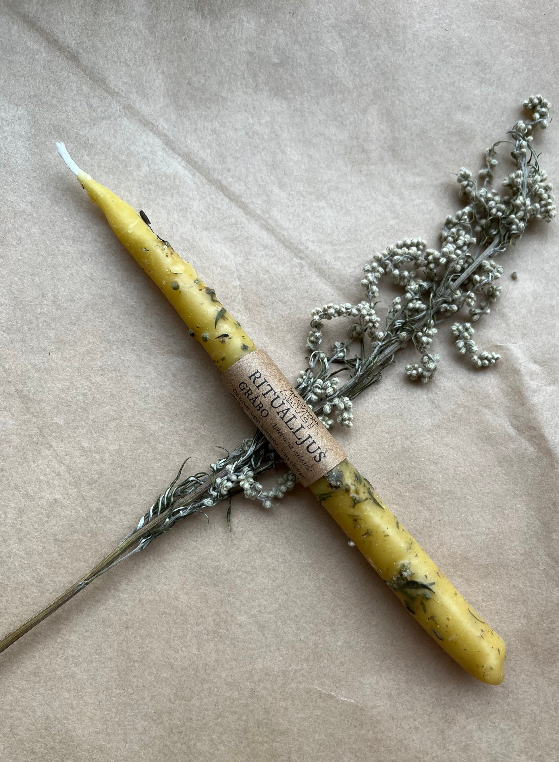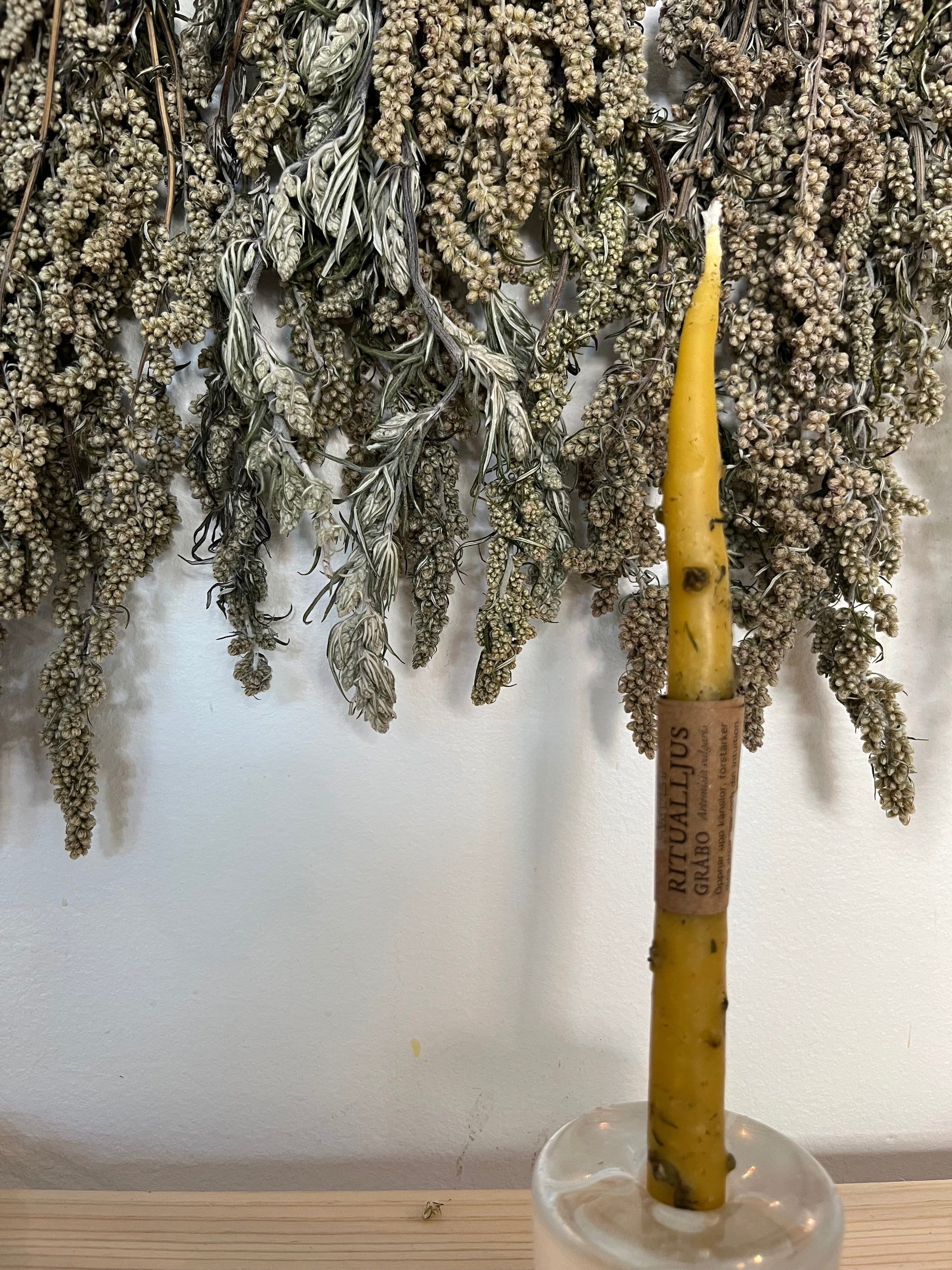 Handstöpta bivaxljus rullade i örter med stärkande egenskaper. Info om varje växt kommer med ljusen.