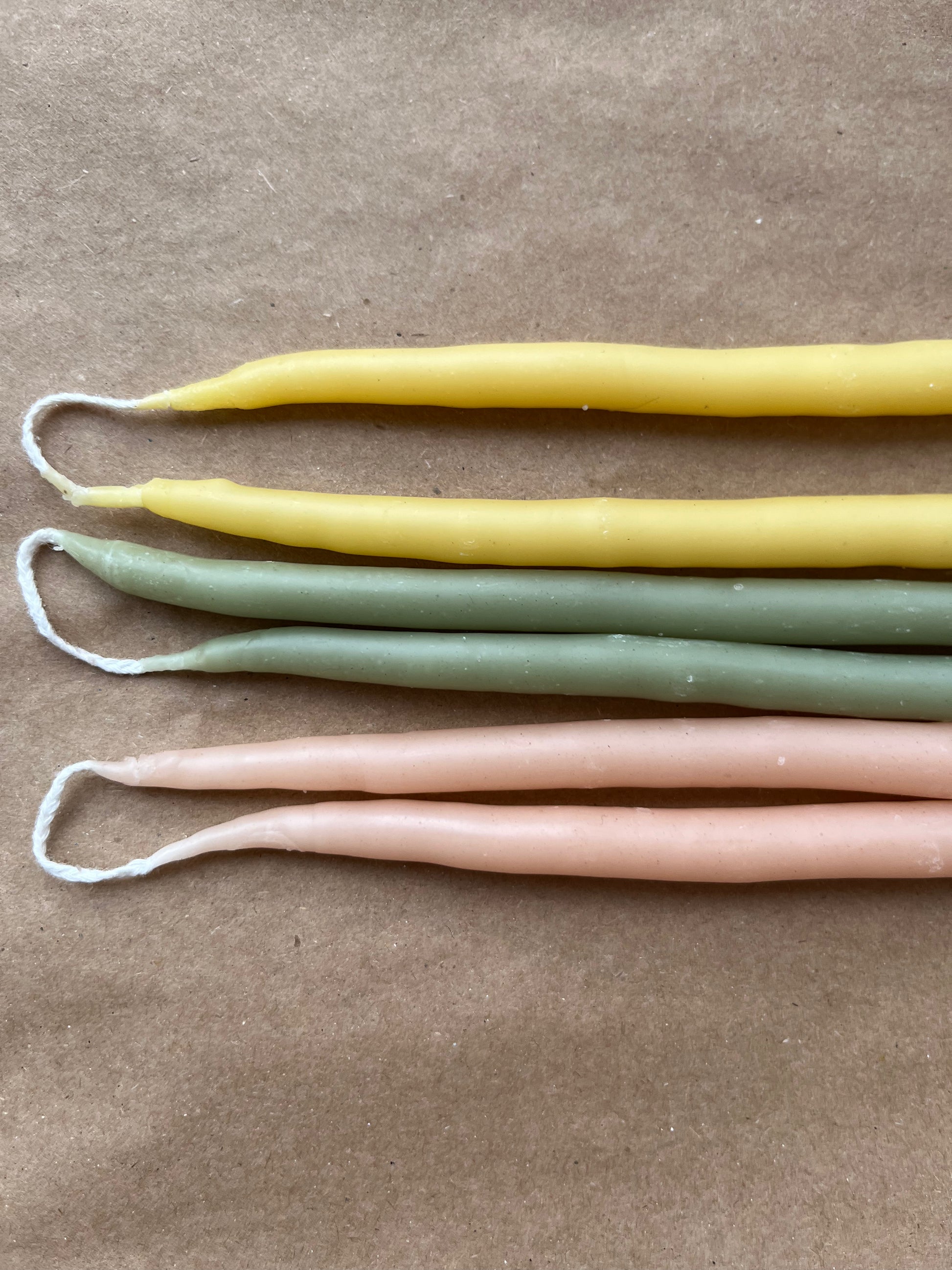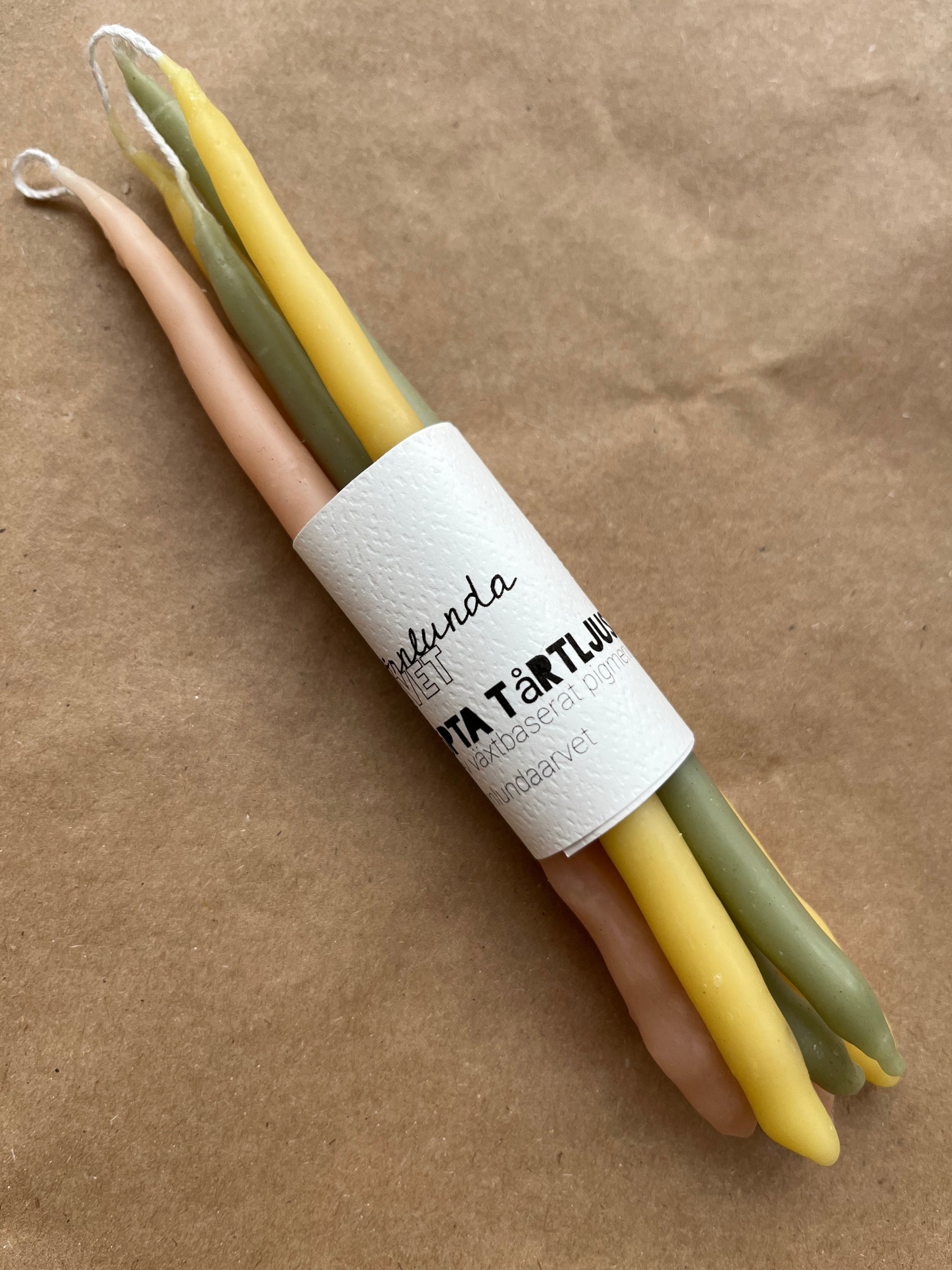 Mina ljus är handstöpta av bivax och färgade med växtpigment. Veke av bomull.